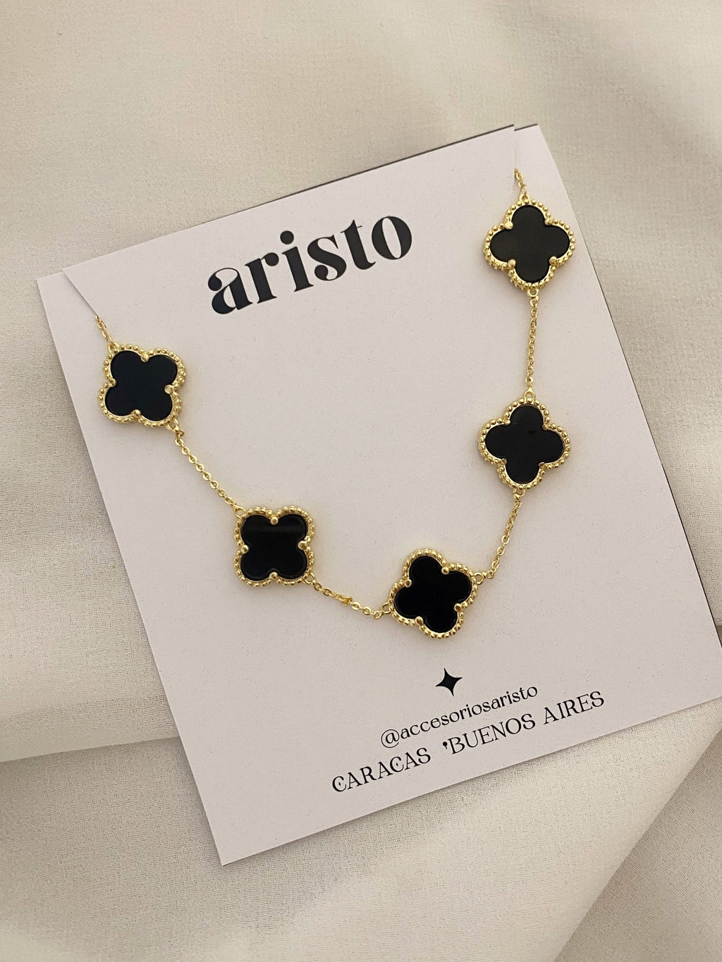 Collar bañado en oro 18k con 5 dijes de trébol negro.