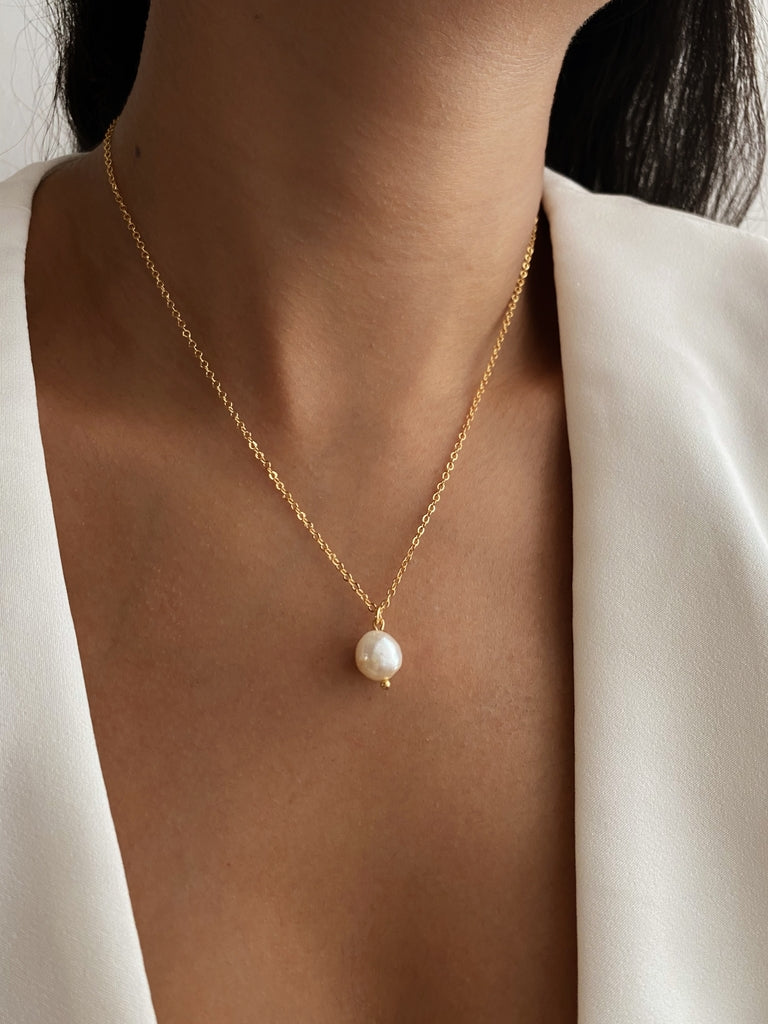 Collar en baño de oro y perla cultivada de 40cm de largo con cadena de extensión.