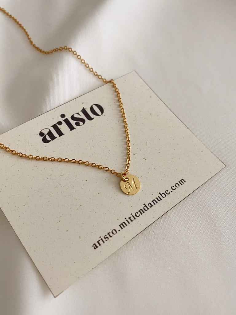 Collar con medalla de inicial grabada, bañado en oro. Largo 40cm + cadena de extensión.